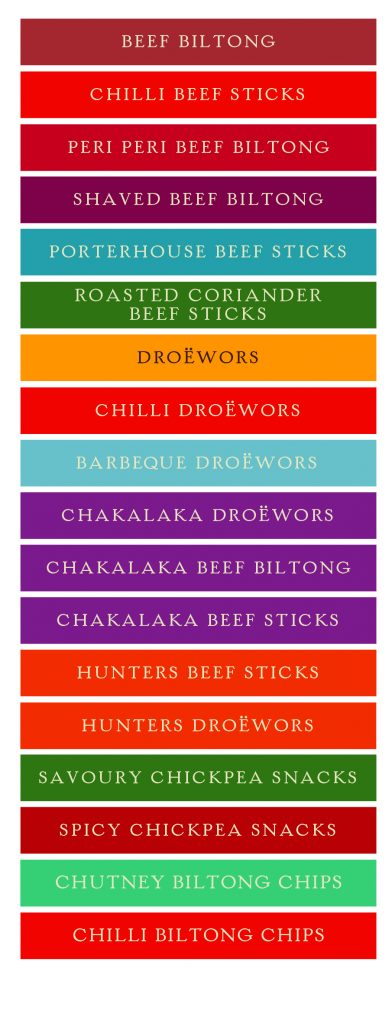 Biltong Sliced: Traditional, Chakalaka, Peri Peri, Shaved Beef. Droëwors: Cylinders and smaller packs